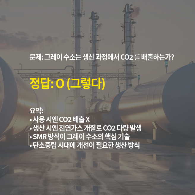 - 그레이 수소: 천연가스 개질(SMR) 과정에서 CO₂ 대량 배출 → 환경성이 낮음